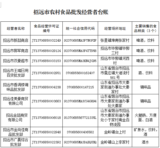 前期,根據(jù)省、市市場監(jiān)管局安排部署,招遠(yuǎn)市市場監(jiān)管局對全市供應(yīng)農(nóng)村地區(qū)食品批發(fā)商信息開展了摸排,建立了農(nóng)村食品批發(fā)經(jīng)營者臺賬,現(xiàn)予以公示,接受社會各界監(jiān)督?! V大群眾如果發(fā)現(xiàn)食品批發(fā)商有違法行為,可