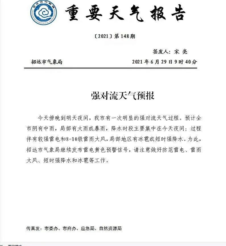 今日9時40分招遠(yuǎn)市氣象局發(fā)布重要天氣報告!強對流天氣預(yù)報今天傍晚到明天夜間,我市有一次明顯的強對流天氣過程。預(yù)計全市陰有中雨,局部有大雨或暴雨,降水時段主要集中在今天夜間;過程伴有較強雷電和8-10