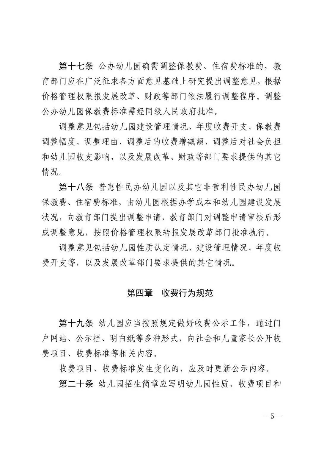 一是明確幼兒園收費(fèi)項(xiàng)目和定價(jià)權(quán)限。規(guī)定幼兒園收費(fèi)項(xiàng)目包括保育教育費(fèi)(以下簡(jiǎn)稱(chēng)保教費(fèi))、住宿費(fèi)、服務(wù)性收費(fèi)和代收費(fèi)。公辦幼兒園、普惠性民辦幼兒園和其它非營(yíng)利性民辦幼兒園的保教費(fèi)、住宿費(fèi)實(shí)行政府定價(jià)或政府指導(dǎo)價(jià),服務(wù)性收費(fèi)和代收費(fèi)實(shí)行市場(chǎng)調(diào)節(jié)價(jià)。營(yíng)利性民辦幼兒園收費(fèi)實(shí)行市場(chǎng)調(diào)節(jié)價(jià)。實(shí)行政府定價(jià)或政府指導(dǎo)價(jià)管理的幼兒園收費(fèi)項(xiàng)目,其收費(fèi)標(biāo)準(zhǔn)由各市、縣(市、區(qū))人民政府制定。具體分級(jí)管理范圍由市人民政府確定。