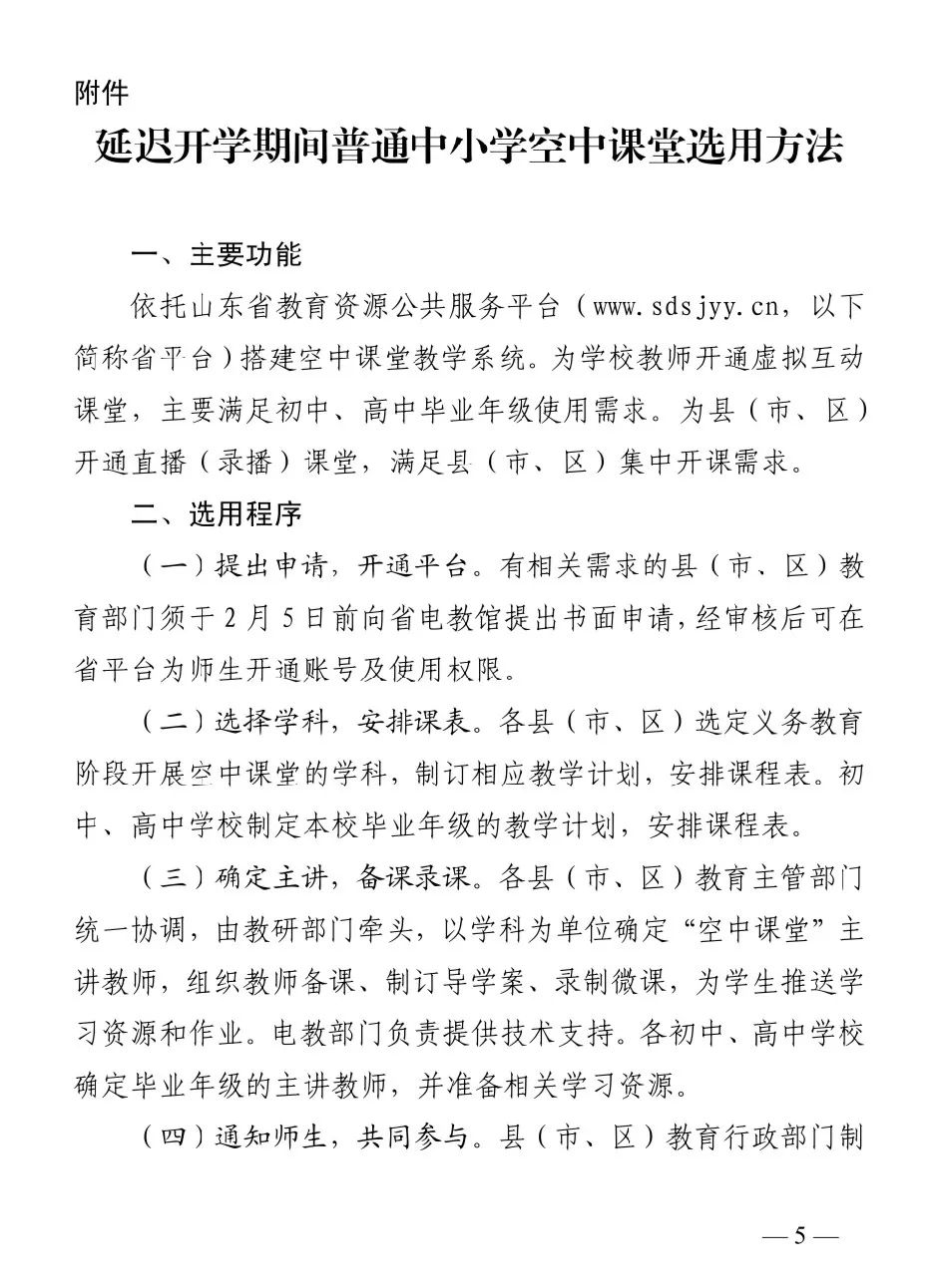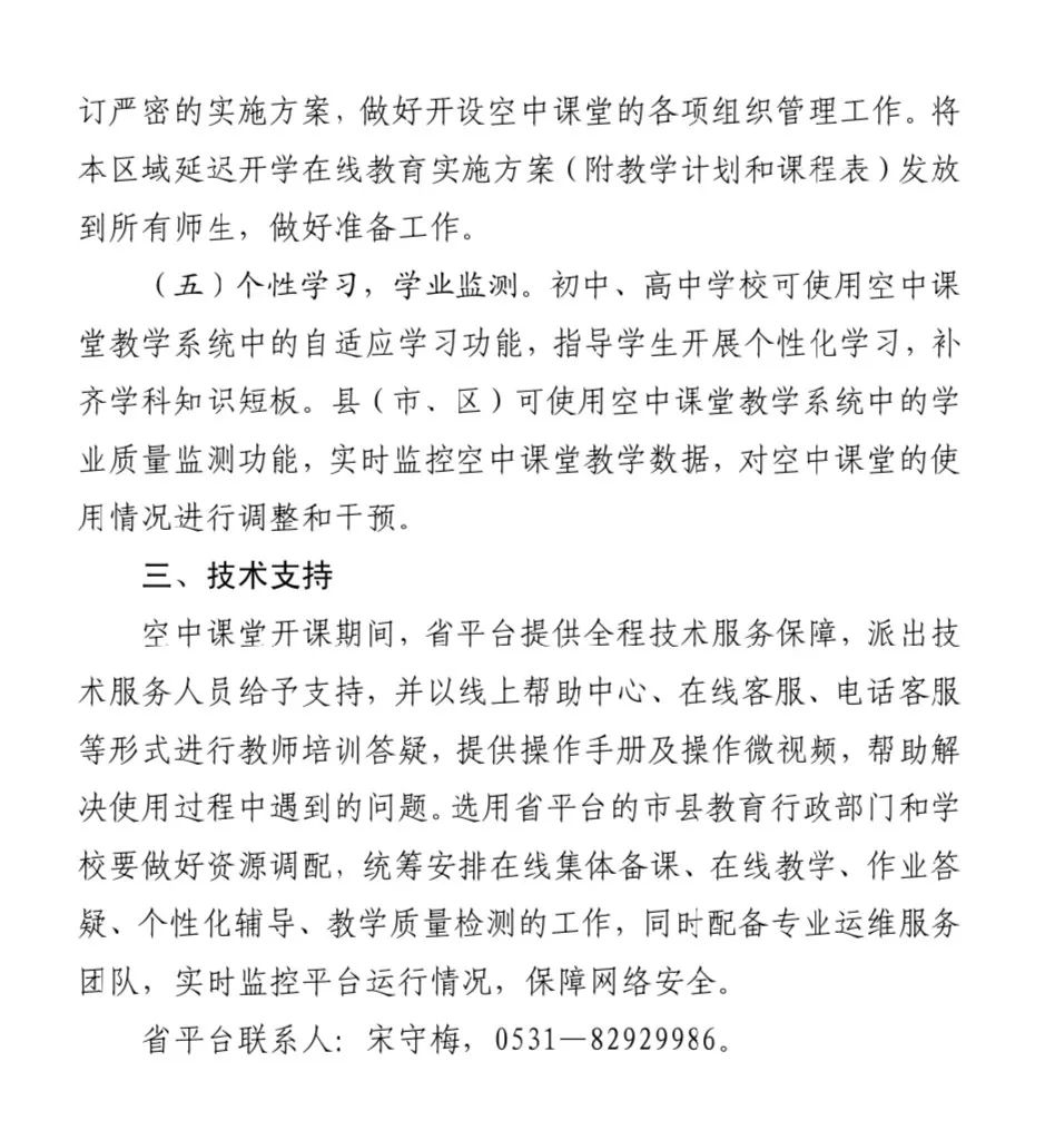 鼓勵各地和學(xué)校充分利用信息化技術(shù)、網(wǎng)絡(luò)資源和平臺,開展網(wǎng)絡(luò)教學(xué)、線上答疑等學(xué)業(yè)指導(dǎo),讓學(xué)生停課不停學(xué)。線上學(xué)業(yè)指導(dǎo)應(yīng)以學(xué)生自主學(xué)習(xí)為主、教師輔導(dǎo)答疑為輔。省教育廳已協(xié)調(diào)征集數(shù)字教材、“一師一優(yōu)課、一課一名師”等資源,在山東省教育云服務(wù)平臺建立線上學(xué)業(yè)指導(dǎo)參考資源庫。依托山東省教育資源公共服務(wù)平臺搭建起“空中課堂”,供各地假期自主選用。