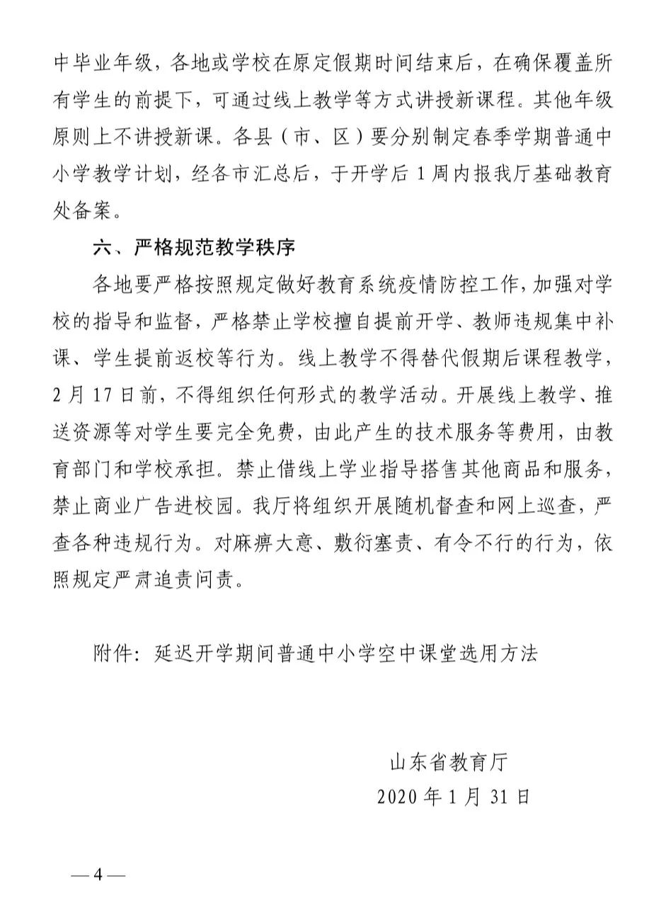 嚴格禁止學(xué)校擅自提前開學(xué)、教師違規(guī)集中補課、學(xué)生提前返校等行為。線上教學(xué)不得替代假期后課程教學(xué),2月17日前,不得組織任何形式的教學(xué)活動。開展線上教學(xué)、推送資源等對學(xué)生要完全免費,由此產(chǎn)生的技術(shù)服務(wù)等費用,由教育部門和學(xué)校承擔(dān)。禁止借線上學(xué)業(yè)指導(dǎo)搭售其他商品和服務(wù),禁止商業(yè)廣告進校園。省教育廳將組織開展隨機督查和網(wǎng)上巡查各種違規(guī)行為。對麻痹大意、敷衍塞責(zé)、有令不行的行為,依照規(guī)定嚴肅追責(zé)問責(zé)。