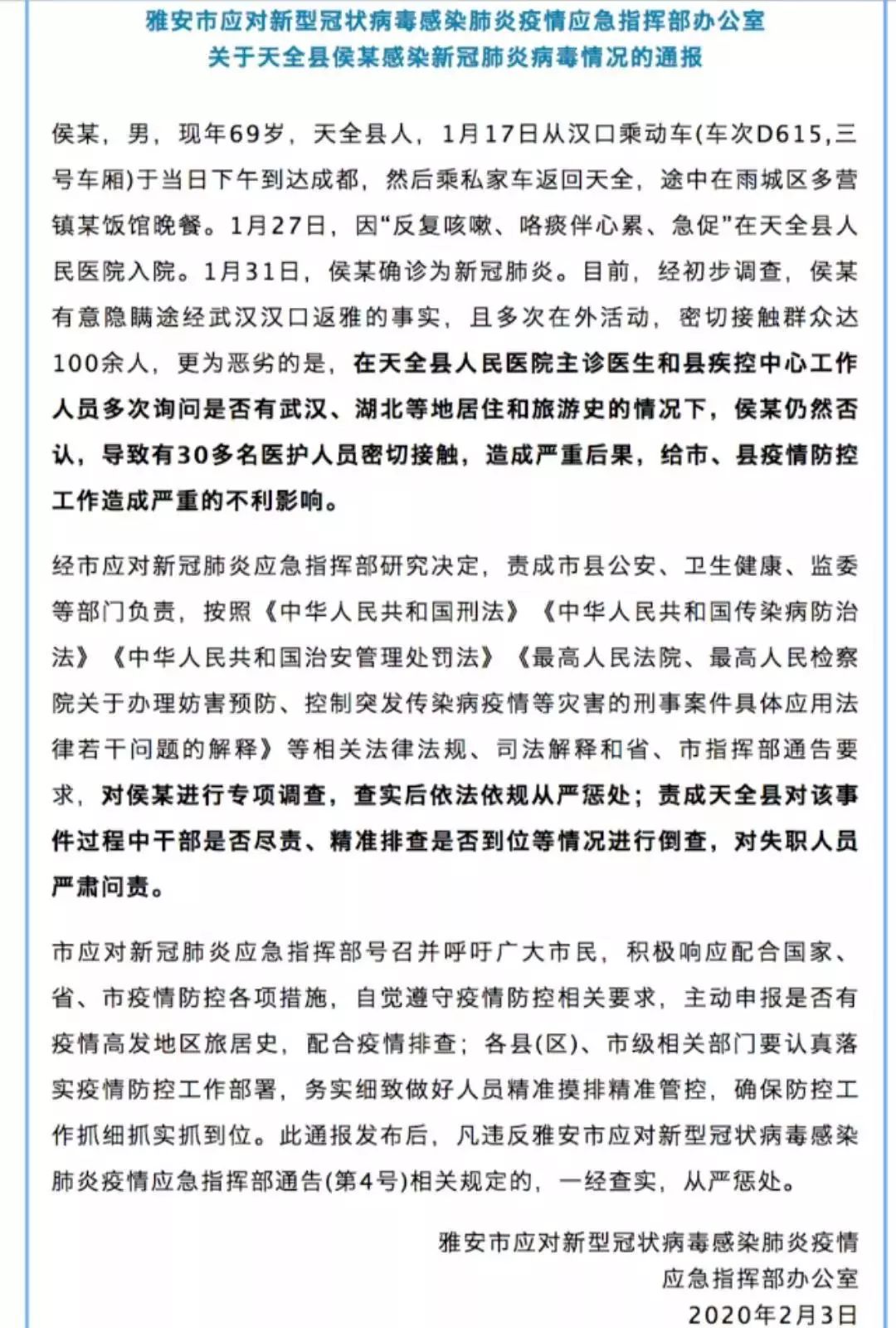 2月3日,四川雅安發(fā)布通報,69歲男子侯某有意隱瞞途經(jīng)武漢漢口返回雅安的事實,且多次在外活動,密切接觸群眾達(dá)100余人。