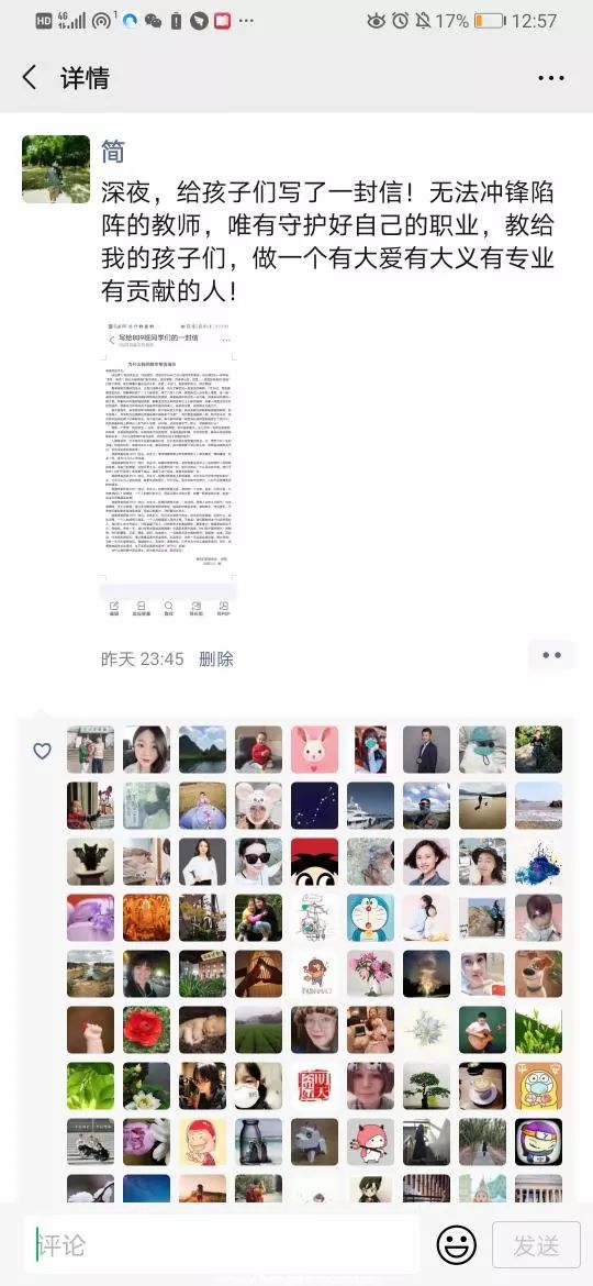 郭簡(jiǎn)老師在朋友圈如是說(shuō):“無(wú)法沖鋒陷陣的教師,唯有守護(hù)好自己的職業(yè),教給我的孩子們,做一個(gè)有大愛(ài)有大義有專業(yè)有貢獻(xiàn)的人!”