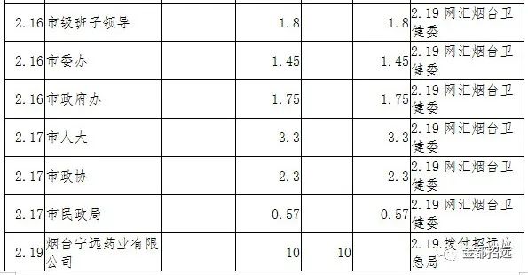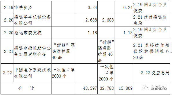 自全市開展抗擊“新型冠狀病毒感染的肺炎疫情”活動以來,招遠(yuǎn)市慈善總會得到了社會各界的積極響應(yīng)和大力支持。截止2月22日24時,累計(jì)捐款48.597萬元,按照捐款意愿,用于招遠(yuǎn)市應(yīng)急局疫情防控的資金32.788萬元,已經(jīng)撥付市應(yīng)急局;用于湖北疫情防控的資金15.809萬元,已劃轉(zhuǎn)煙臺衛(wèi)健委;用于招遠(yuǎn)市疫情防控的所有物資全部交到應(yīng)急局。具體捐贈接收和使用情況公示如下:
