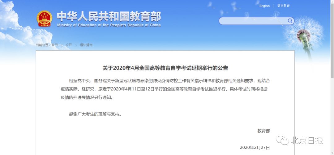 教育部網(wǎng)站2月27日發(fā)布《關(guān)于2020年4月全國高等教育自學(xué)考試延期舉行的公告》。
