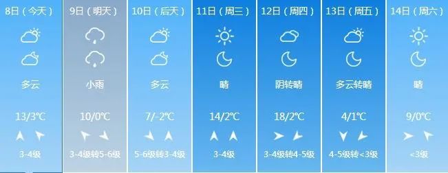預計周一招遠將有一次小雨天氣過程,周三至周四風力較大,招遠溫度回升明顯。周五將有一次較強冷空氣南下,氣溫明顯下降。