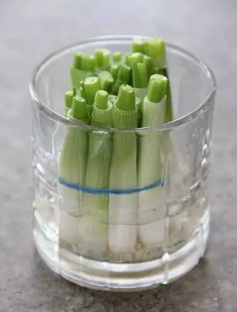 將蔥的根部自莖葉泛青的位置切開(kāi),用橡皮筋捆扎在一起,放在3厘米高的水杯里。
