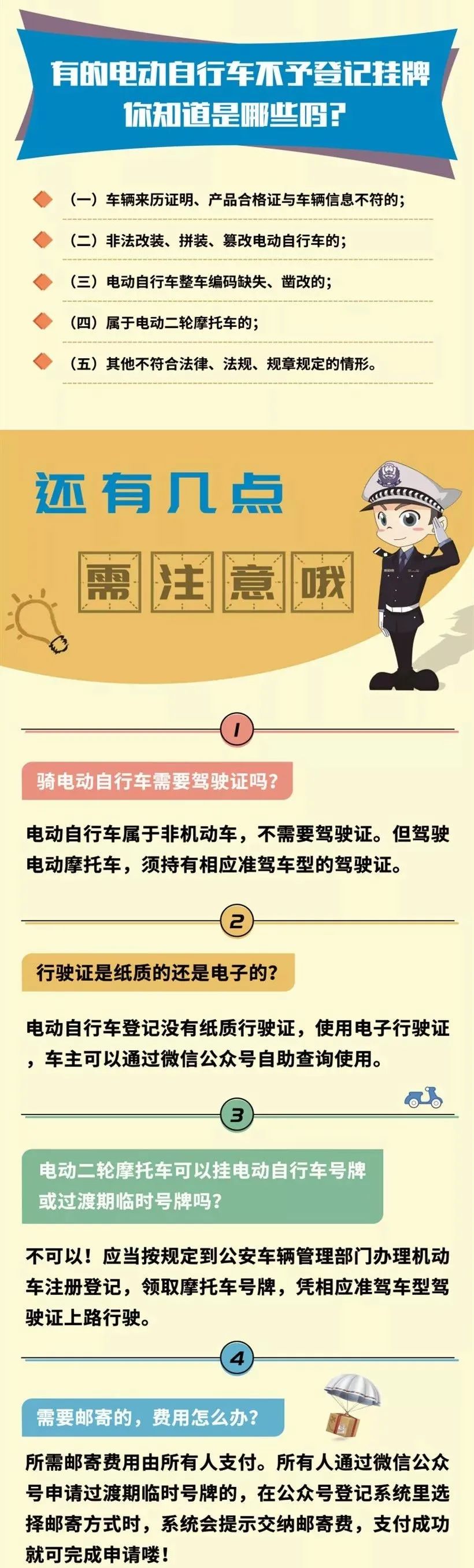 為切實減輕群眾負擔,電動自行車實行免費登記掛牌,號牌制作費用由同級財政承擔,不收取群眾任何費用。