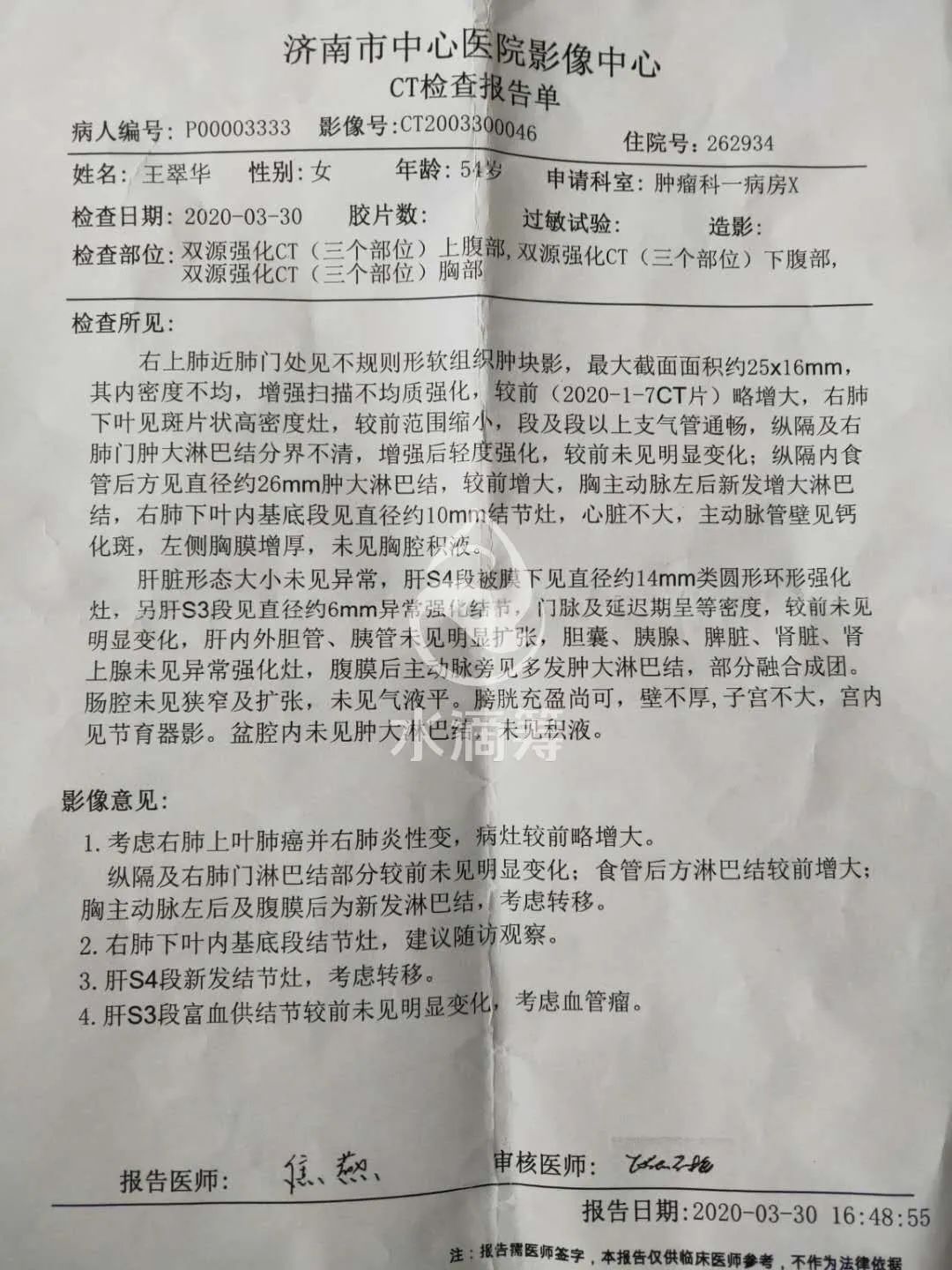 2019年4月份,母親因持續(xù)咳嗽一直在診所輸液治療。前后一個(gè)多月的時(shí)間不見好轉(zhuǎn),診所醫(yī)生建議去醫(yī)院做進(jìn)一步的檢查,5月份在招遠(yuǎn)人民醫(yī)院做支氣管鏡后確診為肺癌。因本地醫(yī)療水平有限,醫(yī)生建議前往上一級(jí)醫(yī)院進(jìn)一步確診。同月份我們聯(lián)系濟(jì)南中心醫(yī)院進(jìn)行檢查,并在該醫(yī)院確診為小細(xì)胞肺癌中晚期。該病無法進(jìn)行手術(shù)治療,只能不間斷的進(jìn)行放化療方式。19年前后共住院6次化療和為期兩個(gè)多月53次放療,一次放療費(fèi)用就要1300!前后一共花將近20萬了,我們已經(jīng)借完了能借的所有親戚朋友。2020年3月回醫(yī)院例行復(fù)查的時(shí)候,被醫(yī)生告知出現(xiàn)復(fù)發(fā)轉(zhuǎn)移的情況,給出兩個(gè)治療方案:繼續(xù)放化療控制病情發(fā)展,另外一種則有20%幾率可以完全治愈的免疫療法,費(fèi)用極高。對(duì)于我們來說哪種方法都是難以承受的壓力。