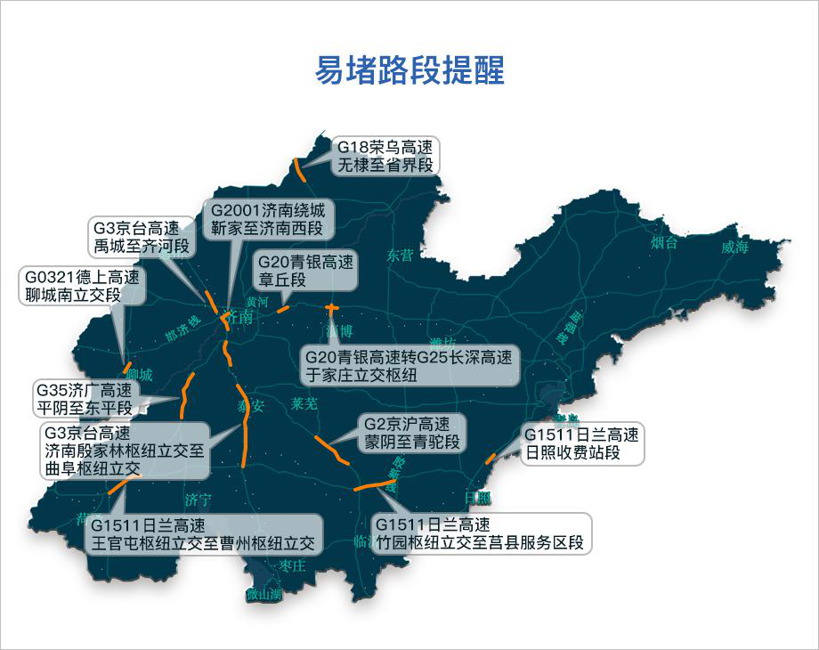 事故易發(fā)路段預(yù)測(cè):根據(jù)近年來(lái)清明期間事故信息統(tǒng)計(jì),預(yù)計(jì)今年高速公路輕微交通事故易發(fā)道路為G2001濟(jì)南繞城高速靳家至濟(jì)南南段、G20青銀高速臨淄至長(zhǎng)深立交段、G2京滬高速曹范收費(fèi)站段、G3京臺(tái)高速泰山立交至寧陽(yáng)東段、G3京臺(tái)高速平原南至齊河北段、G35濟(jì)廣高速平陰南至東平段、G3京臺(tái)高速嶧城站至滕州南樞紐立交段、G1511日蘭高速曹縣段。