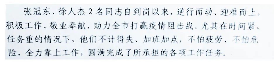 張冠東堅守防疫35天,徐人杰堅守防疫18天,全程無休,加班至凌晨是常態(tài),他們不計得失、不怕疲勞、不怕危險,全力以赴的工作態(tài)度,得到了招遠(yuǎn)市疫情防控指揮部的肯定。