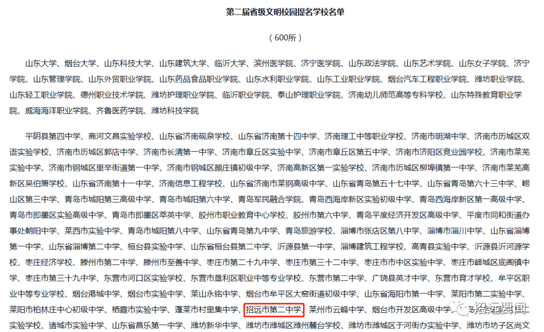 近日,山東省文明辦發(fā)布《山東省第二屆省級文明校園提名學校公示》,公示第二屆省級文明校園提名學校共600所,其中招遠市第二中學入選。