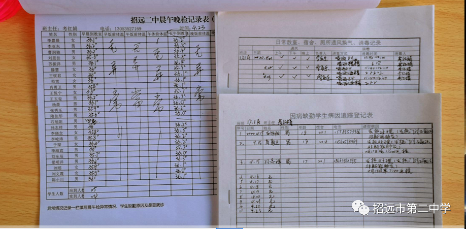 班主任每天對學(xué)生進行八次體溫檢測,三次體溫檢測登記和消毒,做到體溫檢測和消毒嚴(yán)格把關(guān)并隨時記錄好各種通風(fēng)、消毒表格。