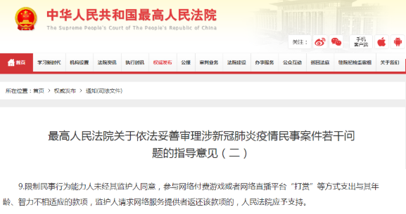 《意見》明確,限制民事行為能力人(8周歲以上的未成年人)未經(jīng)其監(jiān)護(hù)人同意,參與網(wǎng)絡(luò)付費(fèi)游戲或者網(wǎng)絡(luò)直播平臺“打賞”等方式支出與其年齡、智力不相適應(yīng)的款項(xiàng),監(jiān)護(hù)人請求網(wǎng)絡(luò)服務(wù)提供者返還該款項(xiàng)的,人民法院應(yīng)予支持。