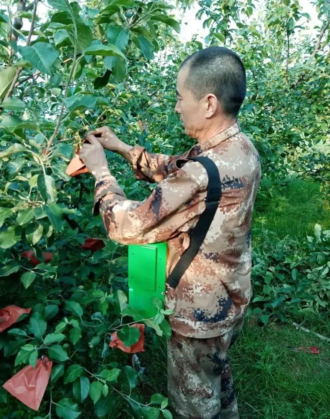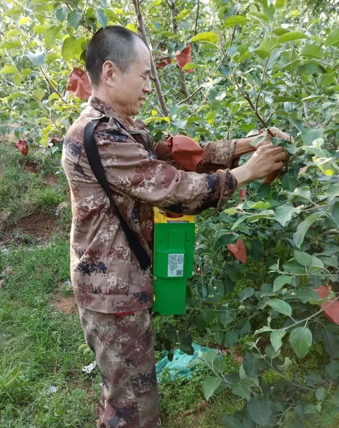 姐姐收看煙臺電視臺的《綠色田園》欄目,介紹這款新上市的蘋果套袋機(jī),趕緊買了一臺,到果園調(diào)試,看看效果如何。