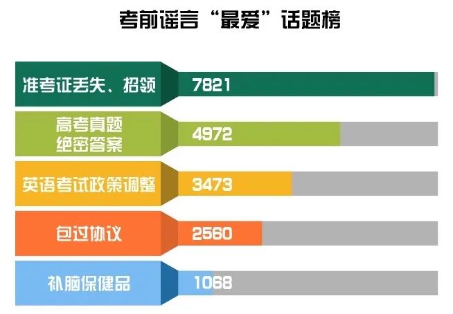 丟準(zhǔn)考證事件每年都有發(fā)生,一方面讓信息真假難辨,迷惑性強(qiáng),不少網(wǎng)民正出于善于轉(zhuǎn)發(fā),給了謠言可乘之機(jī);另一方面,其較高的出現(xiàn)頻率、舊謠新傳等特點(diǎn),也為識(shí)謠辨謠提供了契機(jī)。中國互聯(lián)網(wǎng)聯(lián)合辟謠平臺(tái)對近3年此類謠言進(jìn)行梳理,歸納出此類謠言高頻詞,看到它們,就別轉(zhuǎn)了!