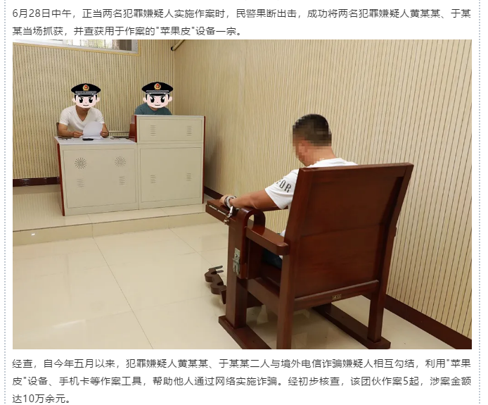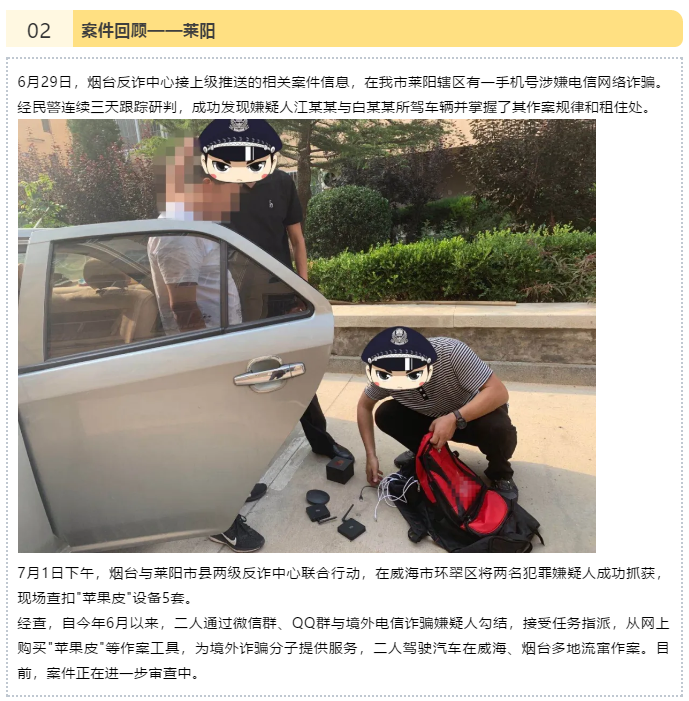 近日,煙臺(tái)市反詐中心經(jīng)過(guò)縝密分析、精心研判,并聯(lián)合龍口、萊陽(yáng)兩地反詐中心偵查布控,成功破獲兩起利用“蘋(píng)果皮”網(wǎng)絡(luò)設(shè)備實(shí)施電信詐騙的案件。這是山東破獲的首例利用“蘋(píng)果皮”網(wǎng)絡(luò)設(shè)備遠(yuǎn)程詐騙的案件。