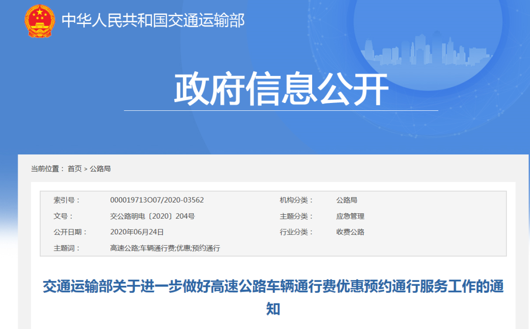 鑒于鮮活農(nóng)產(chǎn)品、跨區(qū)作業(yè)聯(lián)合收割機(jī)運(yùn)輸車(chē)輛普及ETC和熟悉預(yù)約方式還需要一定時(shí)間,為確保預(yù)約通行政策平穩(wěn)順利實(shí)施,充分發(fā)揮社會(huì)效益,部決定將高速公路通行費(fèi)優(yōu)惠預(yù)約通行政策過(guò)渡期延長(zhǎng)至2020年12月31日。
