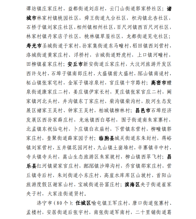 根據(jù)全省鄉(xiāng)村振興戰(zhàn)略規(guī)劃部署要求,在今年1月正式認(rèn)定首批鄉(xiāng)村振興示范縣鄉(xiāng)村的基礎(chǔ)上,省發(fā)展改革委會(huì)同省委組織部等9部門,聯(lián)合啟動(dòng)了第二批鄉(xiāng)村振興“十百千”示范創(chuàng)建工程,探索創(chuàng)新多元模式和成功經(jīng)驗(yàn),以點(diǎn)帶面推動(dòng)全省鄉(xiāng)村振興戰(zhàn)略健康有序進(jìn)行。經(jīng)“各市篩選上報(bào)、省級(jí)聯(lián)合審查、征求意見建議”,并報(bào)請(qǐng)省委、省政府同意,現(xiàn)確定壽光市等13個(gè)縣(市、區(qū))、長清區(qū)文昌街道等108個(gè)鄉(xiāng)(鎮(zhèn)、街)、平陰縣榆山街道翟莊村等1027個(gè)村為第二批示范創(chuàng)建單位。