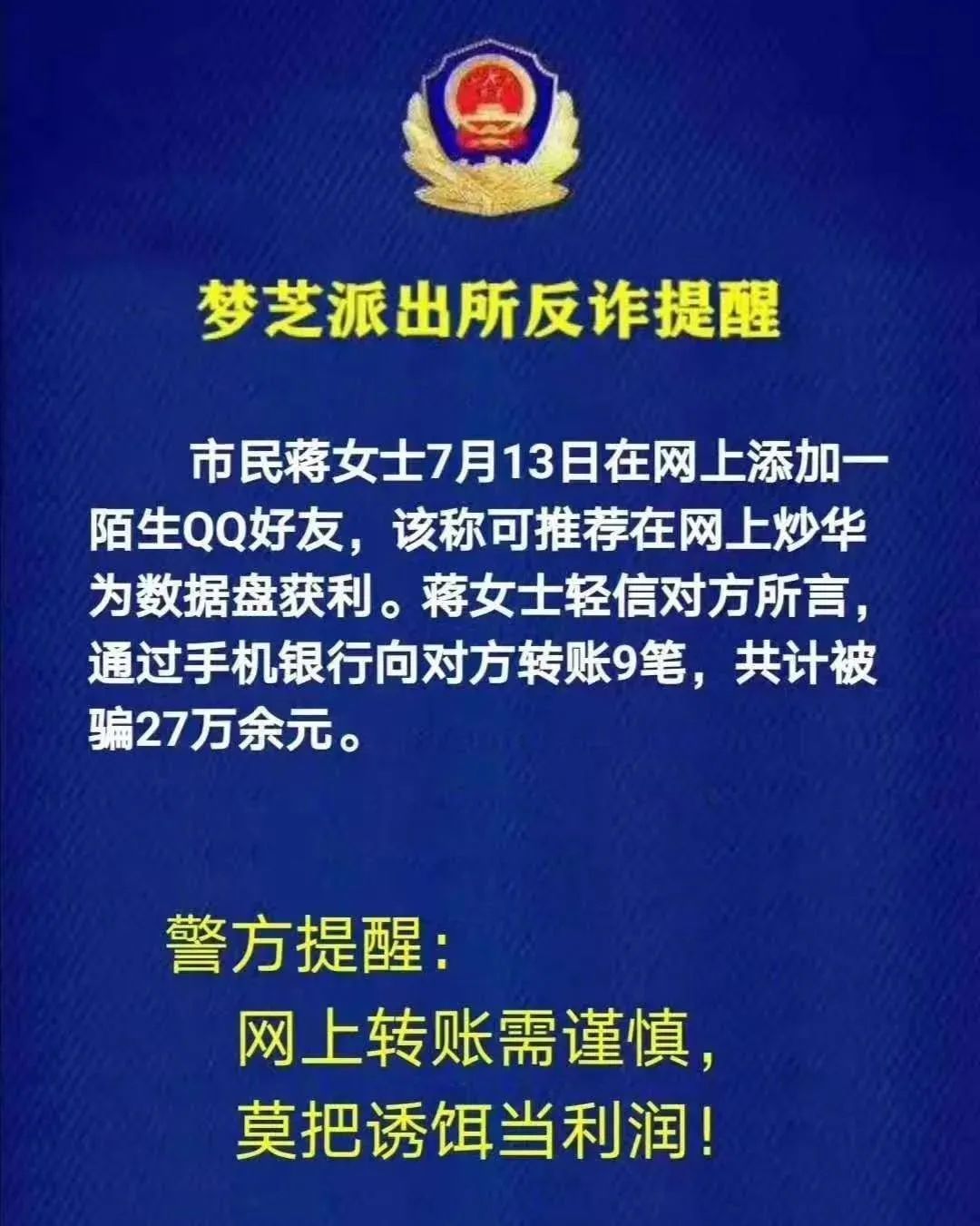 提示中顯示,我市一市民輕信網上炒貨賺錢的謊言,多次匯出巨額金錢,最終被騙。