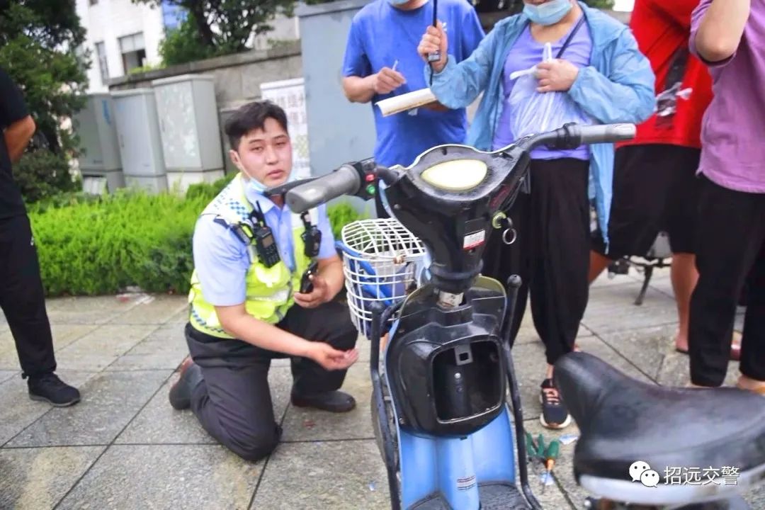 7月23日9時(shí)許,招遠(yuǎn)交警大隊(duì)一中隊(duì)輔警郭明政與同事在溫泉路河?xùn)|路口處,為過(guò)往群眾辦理電動(dòng)車掛牌業(yè)務(wù)。雨時(shí)下時(shí)停,但絲毫沒(méi)有影響小郭和同事們的熱情?!按蟾?,您別急,我把這個(gè)電動(dòng)車牌掛上就看看您的車?!薄按笠蹋@個(gè)車需要提供購(gòu)車發(fā)票和合格證?!毙」托牡南蛉罕娊忉屴k理程序。有的電動(dòng)車車架號(hào)在車底,為了方便,小郭單膝跪地查看登記。