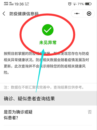 第四步 點(diǎn)擊“查看本人防疫健康詳情”,出現(xiàn)“未見異?!苯缑?zhèn)洳椤?/span>