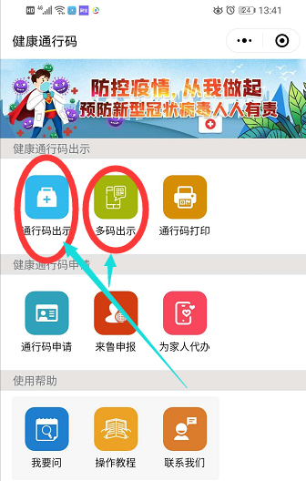 第二步 點(diǎn)擊防疫專區(qū)—健康通行卡,根據(jù)個(gè)人情況點(diǎn)擊通行碼申請(qǐng)(或來(lái)魯申請(qǐng)或?yàn)榧胰舜k)。