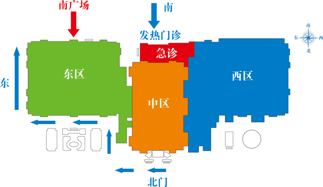 發(fā)熱門診位于中區(qū)門診樓南門9號門西側(cè)。