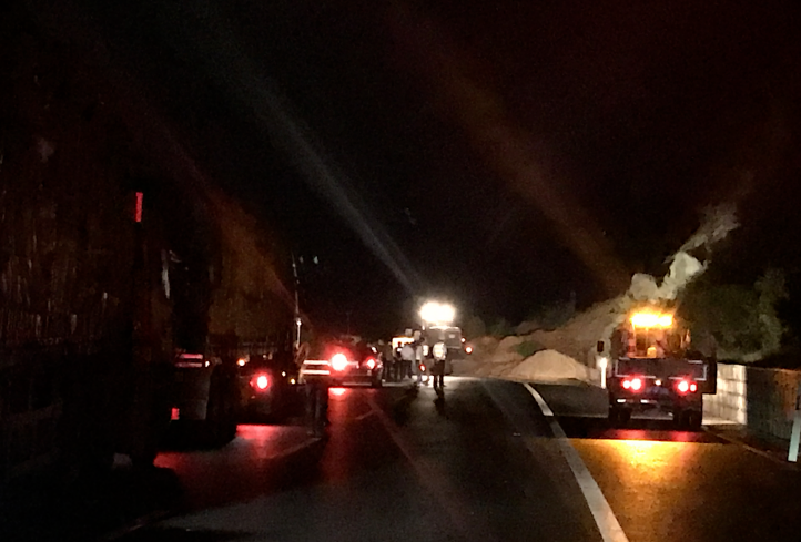 此次滑坡災害未造成車輛和人員損傷,但現(xiàn)場存在大量泥沙和巨石散落,將高速公路一側(cè)道路全部掩埋,滑坡方量約2000余方。邊坡中上部有碎石間歇滾落,情況仍不穩(wěn)定,存在二次災害隱患。針對這一情況,山東省地質(zhì)礦產(chǎn)勘查開發(fā)局第六地質(zhì)大隊專家組提出,應迅速疏散崩滑體附近車輛,現(xiàn)場工作人員要盡量遠離受損坡面并盡快組織機械設備進場,沿最外側(cè)清理出一條通道,以便受堵大貨車、客車及時駛離災害現(xiàn)場。由于夜晚視線較差,降雨尚未停止,不利于勘查和施工,專家組建議疏散受阻車輛后全員撤離現(xiàn)場,保持高速封閉,待天亮再進行排險施工。