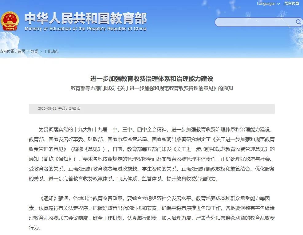 日前,教育部等五部門印發(fā)《關(guān)于進(jìn)一步加強和規(guī)范教育收費管理的意見》的通知(簡稱《通知》),要求各地按照規(guī)定的管理權(quán)限全面落實教育收費管理主體責(zé)任,正確處理好政府與社會、受教育者的關(guān)系,正確處理好教育收費與財政撥款、學(xué)生資助的關(guān)系,正確處理好簡政放權(quán)和放管結(jié)合、優(yōu)化服務(wù)的關(guān)系,進(jìn)一步完善教育收費政策體系、制度體系、監(jiān)管體系,提升教育收費治理能力。