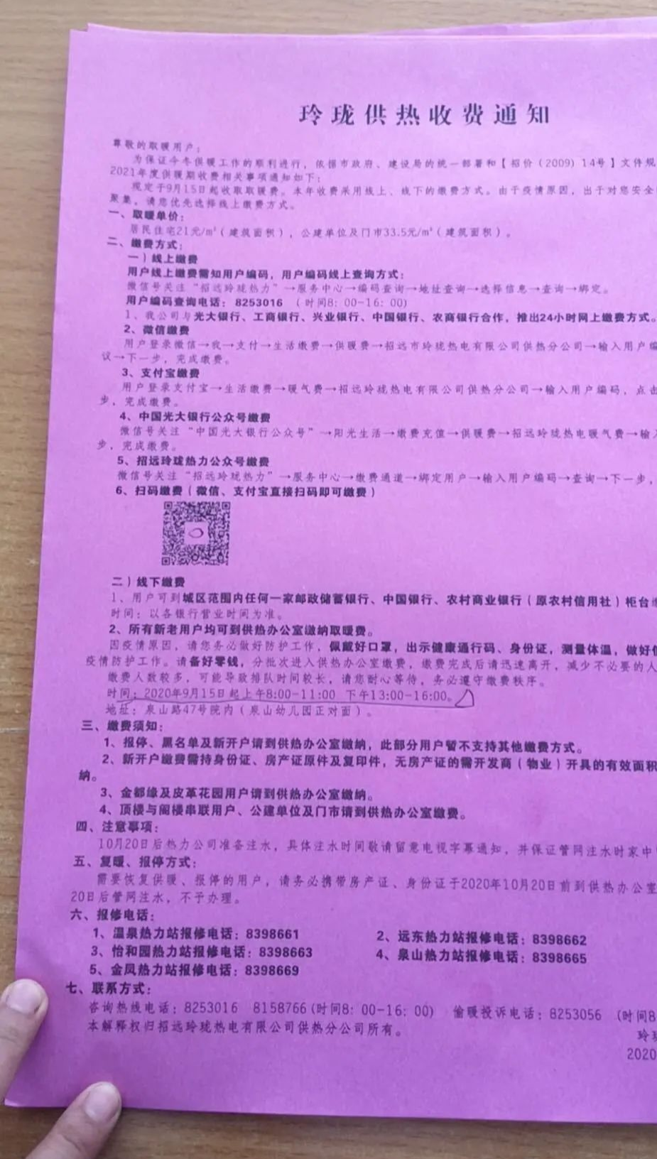 線上繳費:微信繳費、支付寶繳費、中國光大銀行公眾號繳費、招遠玲瓏熱力公眾號繳費、光大銀行、工商銀行、興業(yè)銀行、中國銀行、農商銀行推出24小時網上繳費。