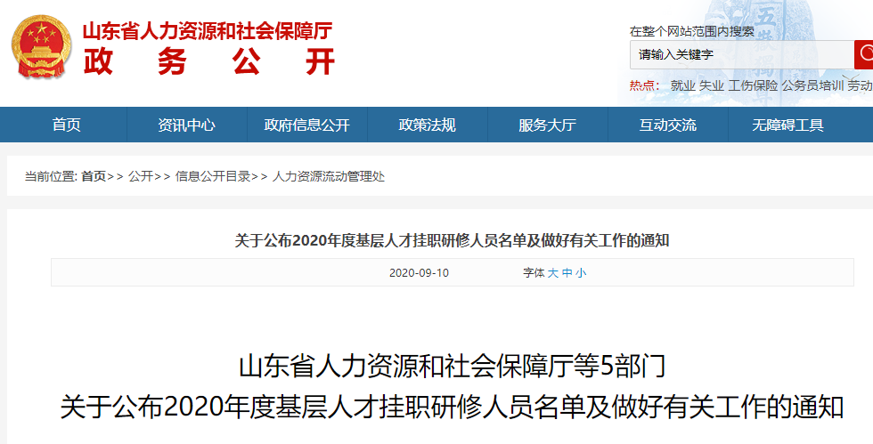 各市人力資源社會保障局、教育局、農(nóng)業(yè)農(nóng)村局(漁業(yè)主管局)、文化和旅游局、衛(wèi)生健康委,各有關(guān)單位:根據(jù)《關(guān)于組織推薦2020年度基層人才掛職研修人選的通知》要求,前期,各市教育、農(nóng)業(yè)農(nóng)村、文化旅游、衛(wèi)生健康系統(tǒng)開展了掛職研修人選的選拔推薦工作。經(jīng)省人力資源社會保障廳商省教育廳、農(nóng)業(yè)農(nóng)村廳、文化和旅游廳、衛(wèi)生健康委,共確定2020年度全省基層人才掛職研修人員500名,并安排確定了研修單位和指導(dǎo)教師(見附件)?,F(xiàn)就有關(guān)事宜通知如下:2020年度掛職研修時間為2020年9月—2021年9月,研修人員應(yīng)于2020年9月15日前到研修單位報到。(一)根據(jù)《關(guān)于印發(fā)<關(guān)于加強對西部經(jīng)濟隆起帶和省扶貧開發(fā)重點區(qū)域人才支持的意見>有關(guān)工作實施細則的通知》(魯組發(fā)〔2014〕55號)的有關(guān)規(guī)定,待研修人員正式到崗開展掛職研修工作后,省財政按照每人3萬元標準撥付培養(yǎng)經(jīng)費,主要用于研修人員食宿補貼和指導(dǎo)教師相關(guān)補助,其中食宿補貼2萬元,科研補助5000元,指導(dǎo)教師補助5000元。(二)基層人才掛職研修是提高研修人員原工作單位業(yè)務(wù)、科研水平的重要舉措,原工作單位要在經(jīng)費補助方面給予必要支持。掛職研修期間,異地研修人員原則上每月往返不超過兩次,累計在途時間不超過4天,往返交通費用由派出單位按有關(guān)規(guī)定實報實銷。因工作需要往返超過兩次的,需經(jīng)研修單位、派出單位事前批準。(一)掛職研修方式為全脫產(chǎn),研修人員應(yīng)于2020年9月12日前完成與派出單位的工作交接,不得無故拒絕到研修單位報到。研修期間派出單位不再安排其它工作,研修人員組織關(guān)系轉(zhuǎn)入研修單位,派出單位人事關(guān)系及工資福利待遇保持不變,行政職務(wù)安排、專業(yè)技術(shù)職務(wù)評聘等不受影響。(二)研修期間,省、市主管部門負責(zé)本系統(tǒng)研修人員的管理工作,日常管理委托研修單位具體負責(zé)。研修單位和指導(dǎo)教師應(yīng)按照注重質(zhì)量、確保實效的原則,根據(jù)研修人員實際情況制定培養(yǎng)方案,確保培養(yǎng)效果,切實幫助基層培養(yǎng)一支骨干人才隊伍。研修期滿前,省人力資源社會保障廳將組織省、市主管部門和研修單位對研修人員進行考核,考核情況作為掛職研修人員年度綜合考核依據(jù)。(三)研修人員應(yīng)嚴格遵守研修單位的有關(guān)規(guī)則制度,尊重指導(dǎo)教師,認真完成學(xué)習(xí)研修任務(wù)。對不服從研修單位管理、學(xué)習(xí)態(tài)度消極的,研修單位可報省主管部門和省人力資源社會保障廳同意后,取消其研修資格,收回培養(yǎng)經(jīng)費,并通報派出單位。