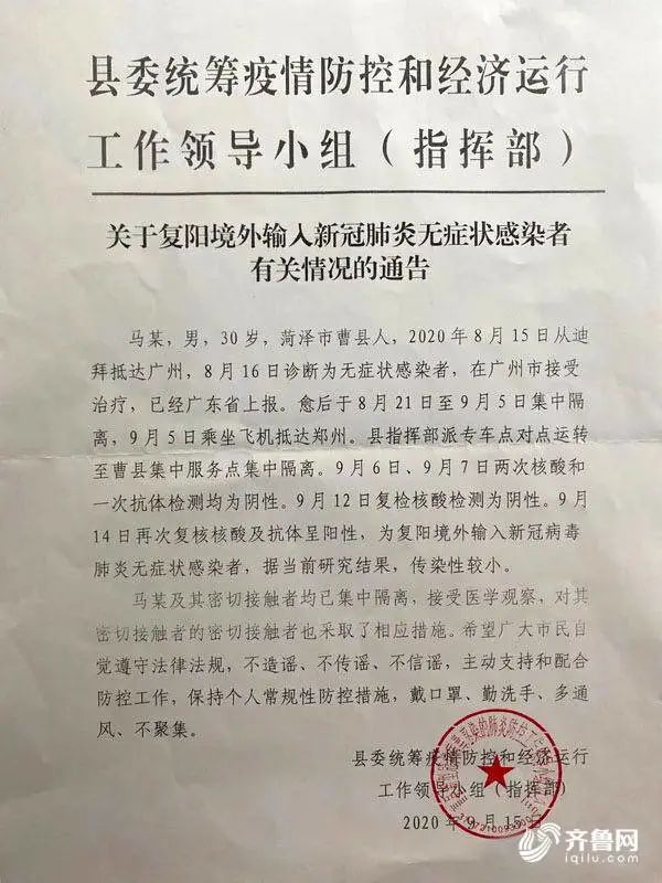 菏澤曹縣縣委統(tǒng)籌疫情防控和經(jīng)濟運行工作領(lǐng)導(dǎo)小組(指揮部)9月15日發(fā)布通告,發(fā)現(xiàn)一例復(fù)陽境外輸入新冠肺炎無癥狀感染者,并對無癥狀感染者馬某相關(guān)情況進行詳細通報。