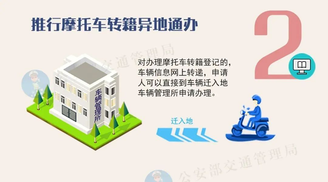 在已實行非營運小微型客車轉(zhuǎn)籍檔案網(wǎng)上轉(zhuǎn)遞的基礎(chǔ)上,推行摩托車轉(zhuǎn)籍信息網(wǎng)上轉(zhuǎn)遞,申請人可以直接到車輛遷入地車輛管理所申請辦理,無需再回遷出地驗車、提取紙質(zhì)檔案。
