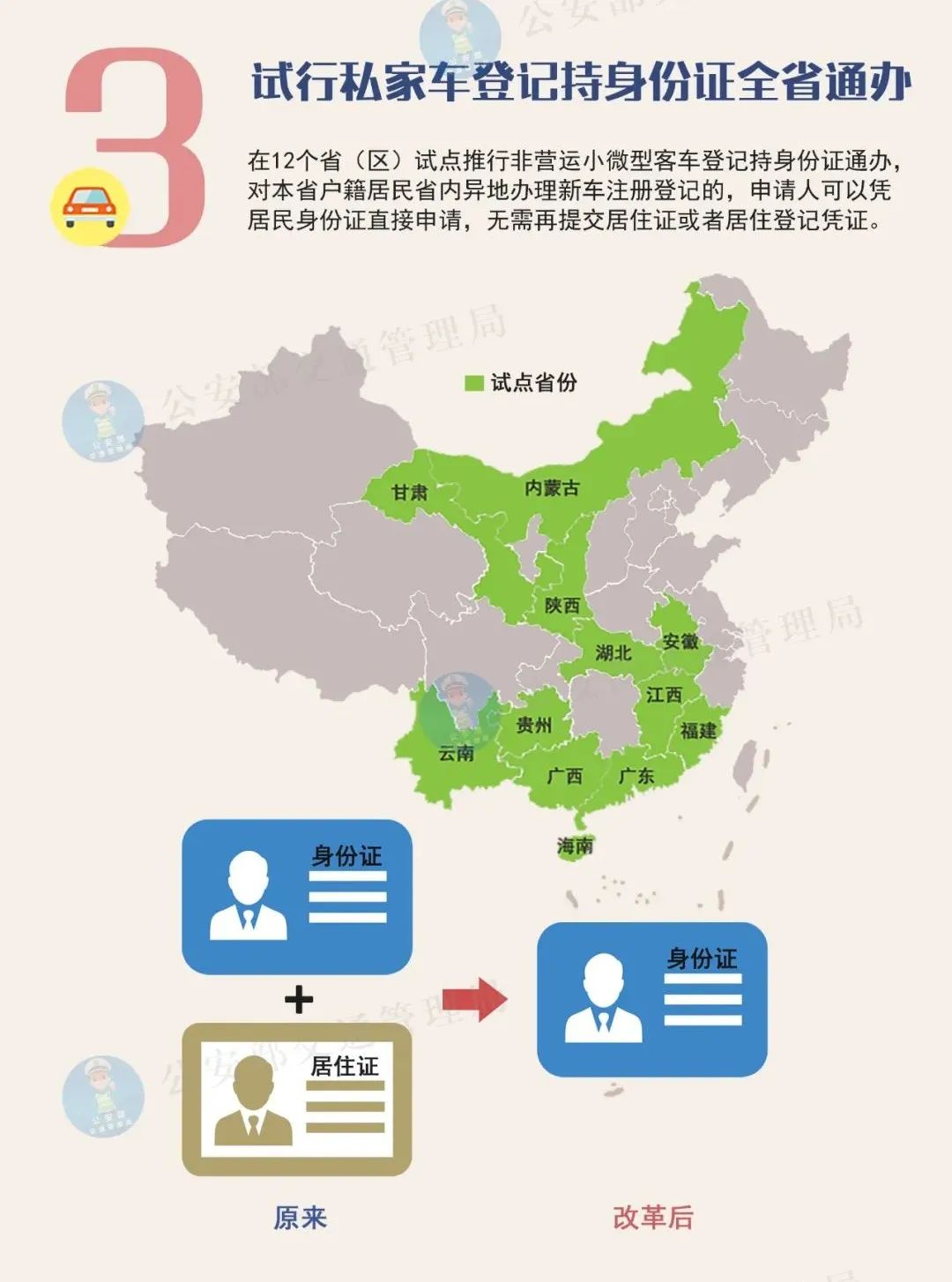 在12個?。▍^(qū))試點推行非營運小微型客車登記持身份證通辦,對本省戶籍居民省內(nèi)異地辦理新車注冊登記的,申請人可以憑居民身份證直接申請,無需再提交居住證或者居住登記憑證。
