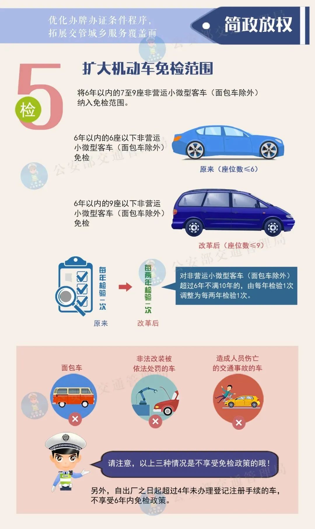 在實行6年內(nèi)6座以下非營運小微型客車免檢基礎(chǔ)上,將6年以內(nèi)的7至9座非營運小微型客車(面包車除外)納入免檢范圍。