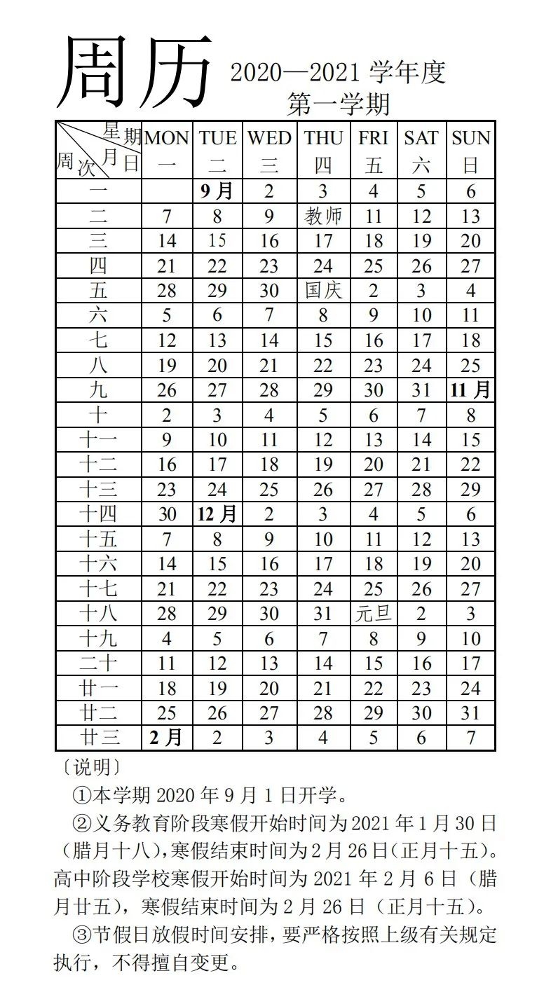 根據(jù)省教育廳假期安排有關(guān)要求,結(jié)合我市實(shí)際以及傳統(tǒng)節(jié)日時(shí)間,現(xiàn)將2021年煙臺(tái)市普通中小學(xué)假期時(shí)間安排通知如下:2020—2021學(xué)年度,我市義務(wù)教育階段學(xué)校寒假放假時(shí)間為:2021年1月25日(農(nóng)歷臘月十三)至2月28日(正月十七),3月1日開(kāi)學(xué)。普通高中學(xué)校寒假放假時(shí)間為2021年2月4日(農(nóng)歷臘月二十三)至2月27日(正月十六),2月28日開(kāi)學(xué)。我市義務(wù)教育階段學(xué)校和普通高中學(xué)校暑假放假時(shí)間統(tǒng)一安排為2021年7月12日至8月29日,8月30日開(kāi)學(xué)。因特殊情況需要調(diào)整寒暑假期安排的區(qū)市,須提前按規(guī)定程序?qū)徟蛡浒浮?/span>2021年,全市中小學(xué)公共節(jié)假日安排原則上按照國(guó)家有關(guān)規(guī)定執(zhí)行,各區(qū)市教體局可結(jié)合實(shí)際對(duì)寄宿制學(xué)校統(tǒng)一安排調(diào)休時(shí)間,直屬普通高中學(xué)??山Y(jié)合實(shí)際安排調(diào)休,但調(diào)休時(shí)間要保證國(guó)家規(guī)定的放假天數(shù),調(diào)休的時(shí)間安排應(yīng)提前向社會(huì)公示并按規(guī)定程序?qū)徟蛡浒?。因?qū)W業(yè)水平考試、中考和高考等原因影響的正常上課時(shí)間,由區(qū)市教體局、直屬有關(guān)學(xué)校統(tǒng)一進(jìn)行調(diào)整并報(bào)市教育局審核、備案。附:山東其他地方已公布的中小學(xué)寒假時(shí)間:寒假安排:義務(wù)教育階段學(xué)校寒假開(kāi)始時(shí)間為2021年1月30日(臘月十八),寒假結(jié)束時(shí)間為2月26日(正月十五)。高中階段學(xué)校寒假開(kāi)始時(shí)間為2021年2月6日(臘月廿五),寒假結(jié)束時(shí)間為2月26日(正月十五)。根據(jù)最新校歷安排,2021年2月28日(星期日)義務(wù)教育學(xué)校、普通高中、中等職業(yè)學(xué)校學(xué)生報(bào)到,3月1日(星期一)義務(wù)教育學(xué)校、普通高中、中等職業(yè)學(xué)校學(xué)生上課;7月5日(星期一)義務(wù)教育學(xué)校學(xué)生暑假開(kāi)始,7月12日(星期一)普通高中、中等職業(yè)學(xué)校學(xué)生暑假開(kāi)始。按照今年6月市教育局發(fā)布的2020-2021學(xué)年度第一學(xué)期校歷,2021年2月1日義務(wù)教育學(xué)校學(xué)生寒假開(kāi)始,2月4日普通高中、中等職業(yè)學(xué)校學(xué)生寒假開(kāi)始。如此計(jì)算,義務(wù)教育學(xué)校學(xué)生寒假共計(jì)27天(報(bào)到日不計(jì)入),普通高中、中等職業(yè)學(xué)校學(xué)生寒假共計(jì)24天(報(bào)到日不計(jì)入)。根據(jù)《關(guān)于2020-2021學(xué)年度全市普通中小學(xué)教學(xué)時(shí)間及寒暑假期安排的通知》安排如下:小學(xué)初中:2021年1月30日至2月28日