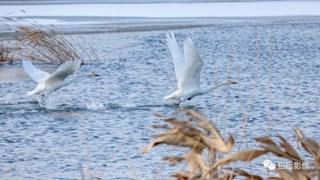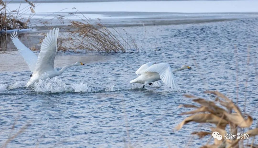 今年冬天,較往年格外寒冷,市內(nèi)的幾個(gè)大型水庫(kù)-勾山、城子和侯家水庫(kù)的庫(kù)面全部冰封,以往在水庫(kù)里面越冬的野生飛羽只得向靠近村莊、鄉(xiāng)鎮(zhèn)的地方去尋找活水源。因此,在招遠(yuǎn)的一些河道里面發(fā)現(xiàn)了許多野鴨、白鷺、蒼鷺等鳥在覓食游弋,攝影師劉秋艷偶然中還發(fā)現(xiàn)了兩只大天鵝來到了招遠(yuǎn)。