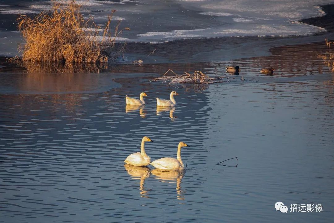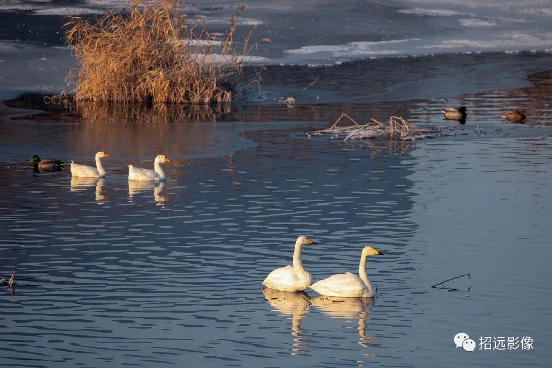 大天鵝作為侯鳥,每年在天氣寒冷的季節(jié),都會(huì)從西北利亞向新疆、河南、山東等地遷徙,前幾年在招遠(yuǎn)的一些水庫(kù)里面也能發(fā)現(xiàn)少量的天鵝。大天鵝與家鵝和睦相處,是今年的新發(fā)現(xiàn)。