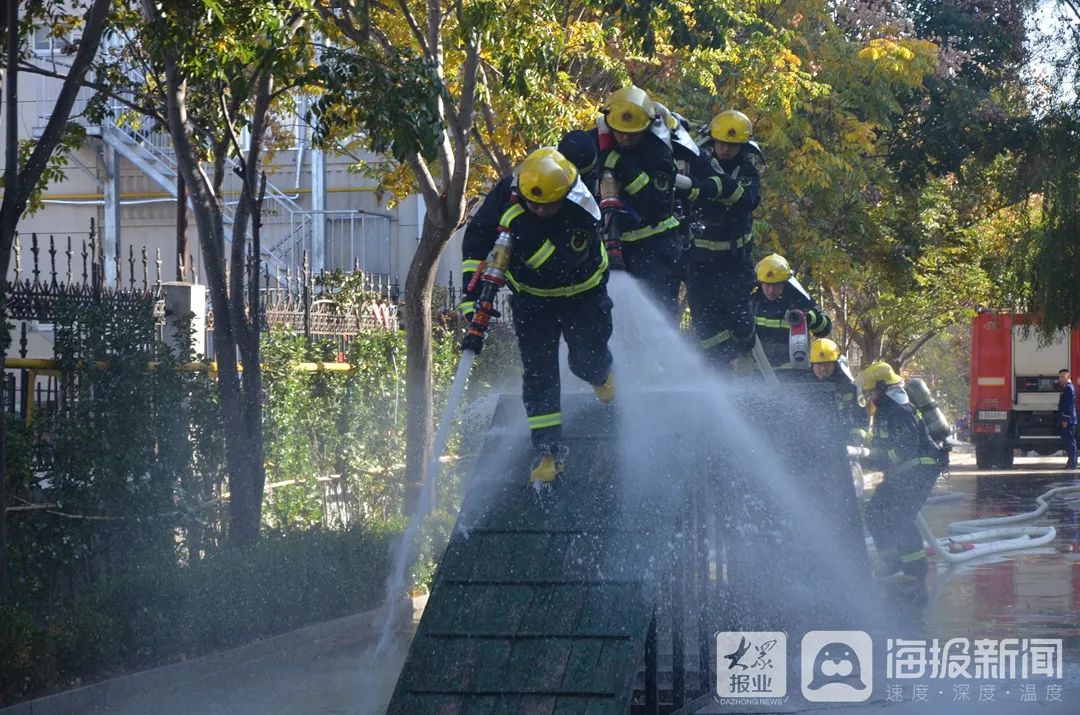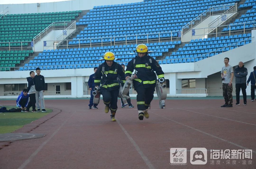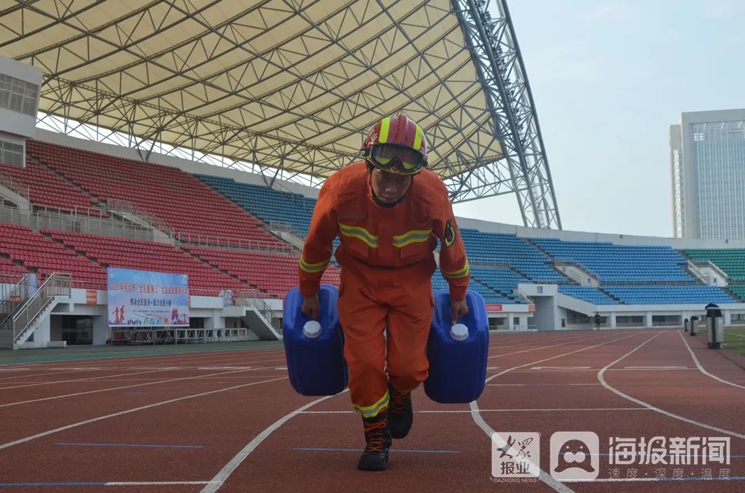 烈日炎炎,室外溫度36℃,地表溫度超過(guò)45℃,招遠(yuǎn)消防員背上空氣呼吸器、穿上厚重的戰(zhàn)斗服,負(fù)重60余斤,開展體能、技能訓(xùn)練。