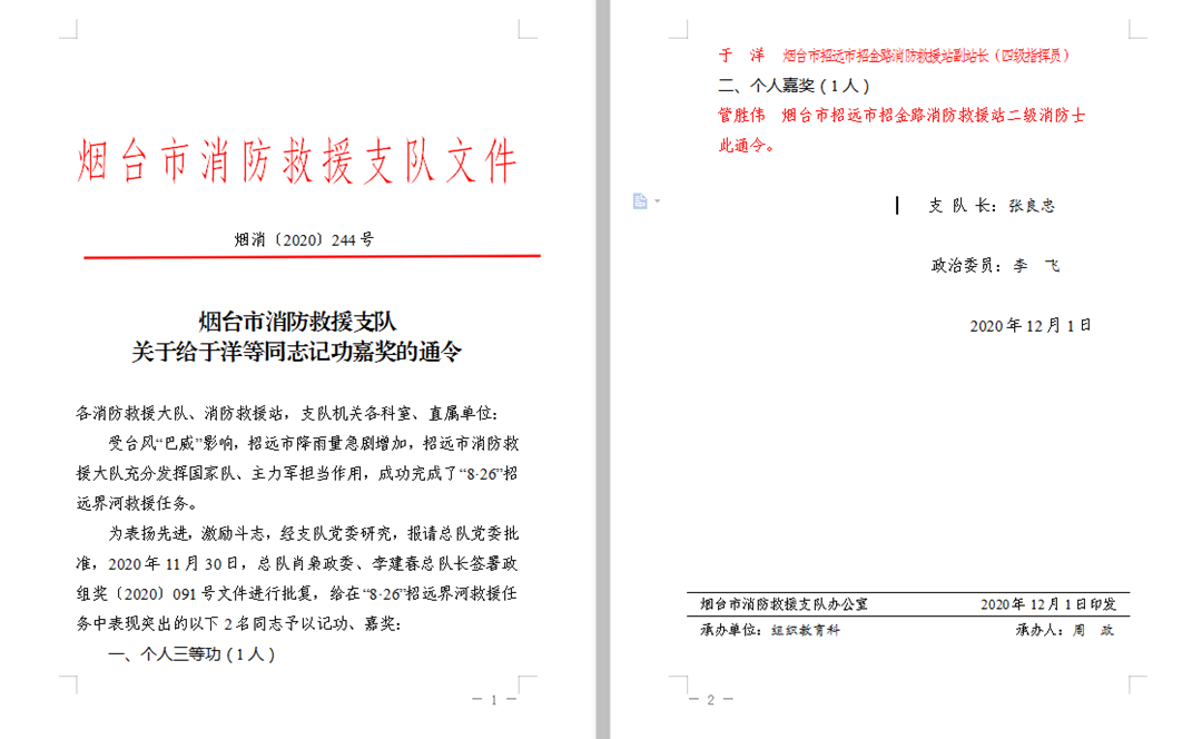 煙臺(tái)市隊(duì)列會(huì)操比賽中,招遠(yuǎn)消防指戰(zhàn)員們奪得第一名;于洋、管勝偉在“8.26”招遠(yuǎn)界河救援中表現(xiàn)突出,分別獲得個(gè)人三等功、個(gè)人嘉獎(jiǎng)。