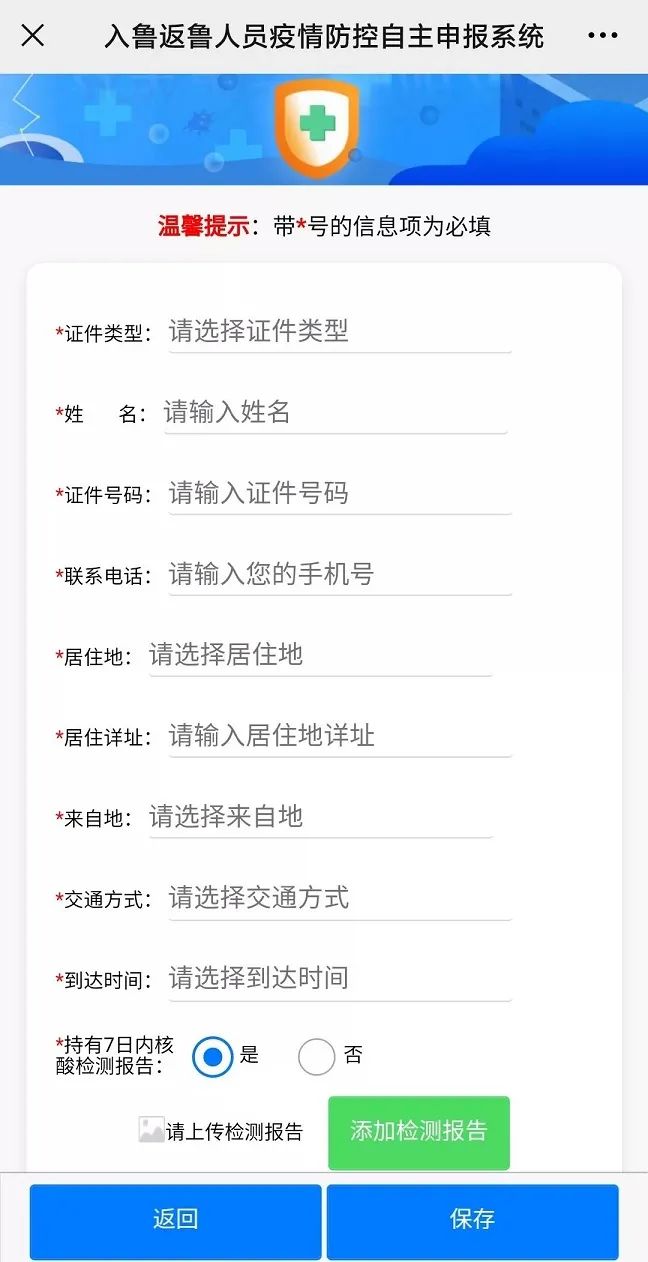 根據(jù)《通知》,“入魯返魯人員疫情防控自主申報系統(tǒng)”已上線,相關(guān)人員可通過微信掃碼或登錄“愛山東”APP進入,主動申報出發(fā)地、目的地、核酸檢測、聯(lián)系方式等相關(guān)內(nèi)容。