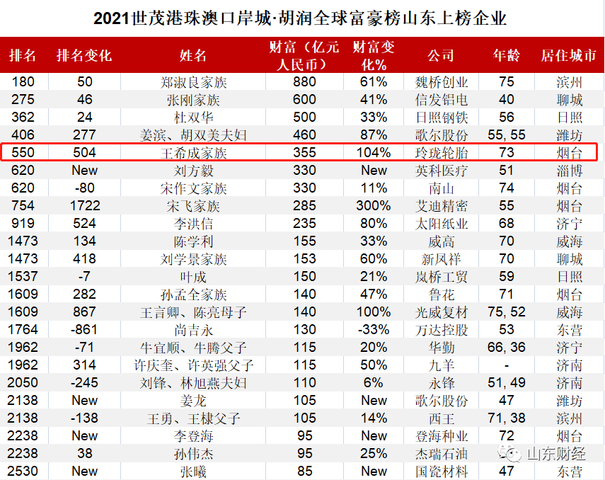 從山東上榜情況看,共有32位企業(yè)家上榜,其中,魏橋創(chuàng)業(yè)的鄭淑良家族以880億元財(cái)富位居上榜山東企業(yè)家首位,信發(fā)鋁電的張剛家族以600億元位居山東第二位,日照鋼鐵杜雙華則以500億元位居上榜山東企業(yè)家第三位。