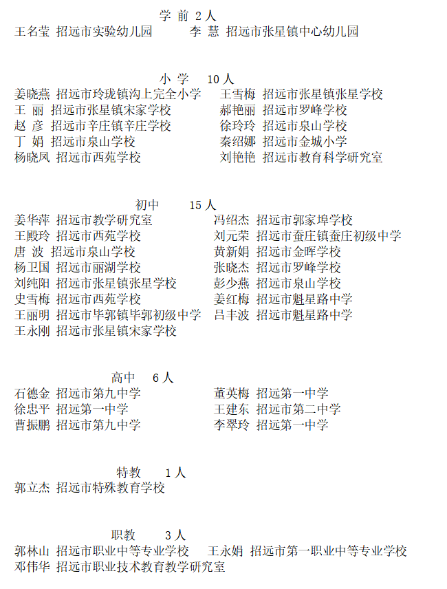 根據(jù)《煙臺市教育局辦公室關(guān)于評選推薦煙臺市第七批教學(xué)能手的通知》精神,經(jīng)個人申報、單位遴選、區(qū)市評選推薦、市審查委員會審查、人員公示等程序,招遠(yuǎn)共37名教師獲評煙臺市第七批教學(xué)能手,現(xiàn)予以公布。