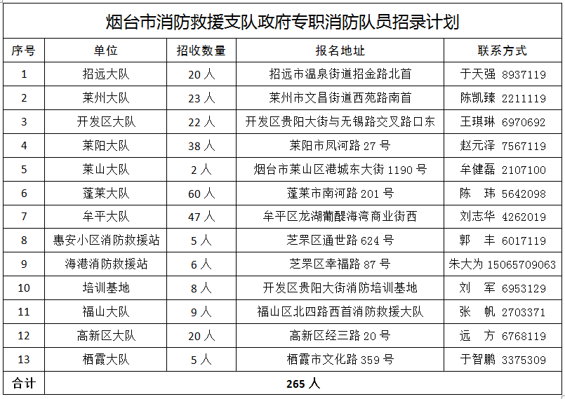 面向社會公開招收265名政府專職消防隊員(限男性),退役士兵及專業(yè)人才優(yōu)先錄用。