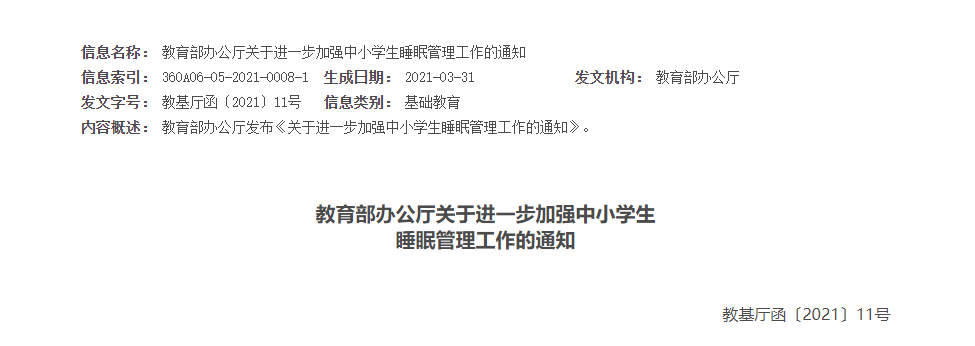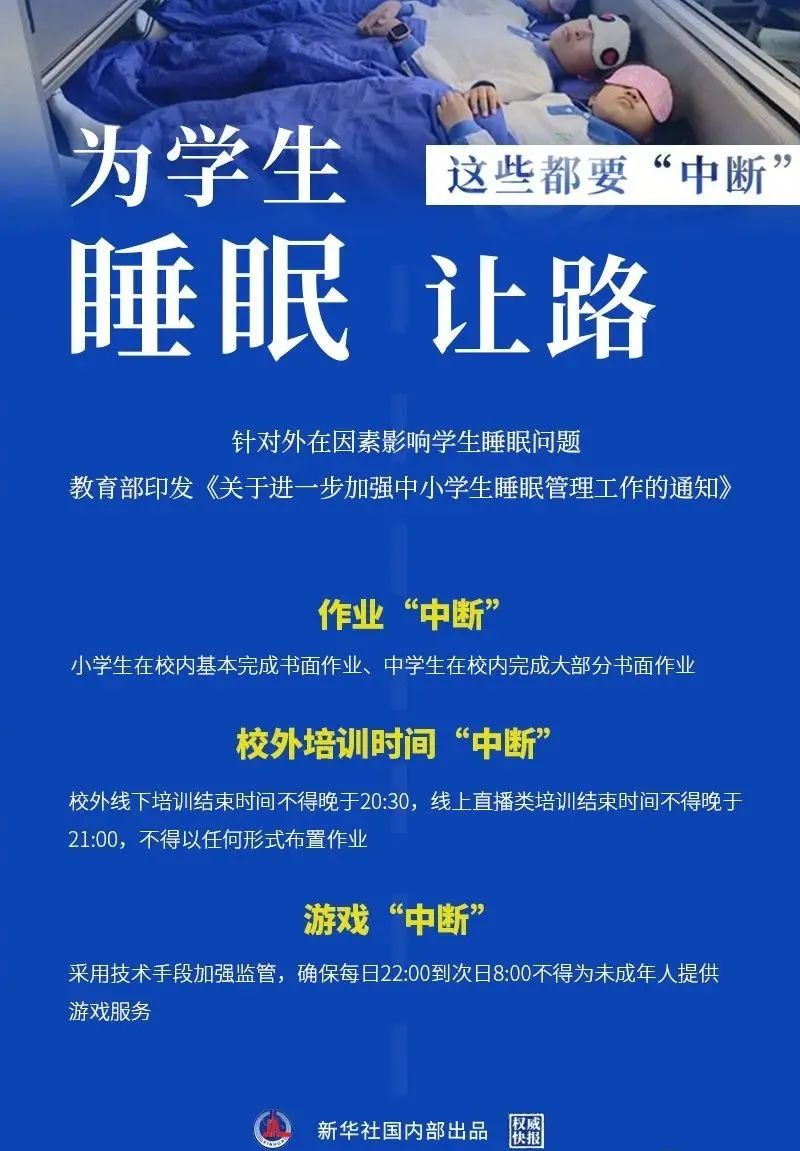 為保證中小學(xué)生享有充足睡眠時間,促進學(xué)生身心健康發(fā)展,現(xiàn)就進一步加強中小學(xué)生睡眠管理工作通知如下。一、加強科學(xué)睡眠宣傳教育。睡眠是機體復(fù)原整合和鞏固記憶的重要環(huán)節(jié),對促進中小學(xué)生大腦發(fā)育、骨骼生長、視力保護、身心健康和提高學(xué)習(xí)能力與效率至關(guān)重要。各地各校要把科學(xué)睡眠宣傳教育納入課程教學(xué)體系、教師培訓(xùn)內(nèi)容和家校協(xié)同育人機制,通過體育與健康課程、心理健康教育、班團隊活動、科普講座以及家長學(xué)校、家長會等多種途徑,大力普及科學(xué)睡眠知識,廣泛宣傳充足睡眠對于中小學(xué)生健康成長的極端重要性,提高教師思想認識,教育學(xué)生養(yǎng)成良好睡眠衛(wèi)生習(xí)慣,引導(dǎo)家長重視做好孩子睡眠管理。二、明確學(xué)生睡眠時間要求。根據(jù)不同年齡段學(xué)生身心發(fā)展特點,小學(xué)生每天睡眠時間應(yīng)達到10小時,初中生應(yīng)達到9小時,高中生應(yīng)達到8小時。學(xué)校、家庭及有關(guān)方面應(yīng)共同努力,確保中小學(xué)生充足睡眠時間。三、統(tǒng)籌安排學(xué)校作息時間。省級教育行政部門要從保證學(xué)生充足睡眠需要出發(fā),結(jié)合實際情況合理確定中小學(xué)作息時間。小學(xué)上午上課時間一般不早于8:20,中學(xué)一般不早于8:00;學(xué)校不得要求學(xué)生提前到校參加統(tǒng)一的教育教學(xué)活動,對于個別因家庭特殊情況提前到校學(xué)生,學(xué)校應(yīng)提前開門、妥善安置;合理安排課間休息和下午上課時間,有條件的地方和學(xué)校應(yīng)保障學(xué)生必要的午休時間;寄宿制學(xué)校要合理安排作息時間,確保學(xué)生達到規(guī)定睡眠時間要求。四、防止學(xué)業(yè)過重擠占睡眠時間。中小學(xué)校要提升課堂教學(xué)實效,加強作業(yè)統(tǒng)籌管理,嚴格按照有關(guān)規(guī)定要求,合理調(diào)控學(xué)生書面作業(yè)總量,指導(dǎo)學(xué)生充分利用自習(xí)課或課后服務(wù)時間,使小學(xué)生在校內(nèi)基本完成書面作業(yè)、中學(xué)生在校內(nèi)完成大部分書面作業(yè),避免學(xué)生回家后作業(yè)時間過長,擠占正常睡眠時間。校外培訓(xùn)機構(gòu)培訓(xùn)結(jié)束時間不得晚于20:30,不得以課前預(yù)習(xí)、課后鞏固、作業(yè)練習(xí)、微信群打卡等任何形式布置作業(yè)。五、合理安排學(xué)生就寢時間。中小學(xué)校要指導(dǎo)家長和學(xué)生,制訂學(xué)生作息時間表,在保證學(xué)生睡眠時間要求前提下,結(jié)合學(xué)生個體睡眠狀況、午休時間等實際,合理確定學(xué)生晚上就寢時間,促進學(xué)生自主管理、規(guī)律作息、按時就寢。小學(xué)生就寢時間一般不晚于21:20;初中生一般不晚于22:00;高中生一般不晚于23:00。個別學(xué)生經(jīng)努力到就寢時間仍未完成作業(yè)的,家長應(yīng)督促按時就寢不熬夜,確保充足睡眠;教師應(yīng)有針對性幫助學(xué)生分析原因,加強學(xué)業(yè)輔導(dǎo),提出改進策略,如有必要可調(diào)整作業(yè)內(nèi)容和作業(yè)量。各地教育部門要會同相關(guān)部門切實加強對轄區(qū)內(nèi)注冊登記或備案的線上培訓(xùn)網(wǎng)課平臺、網(wǎng)絡(luò)游戲的規(guī)范管理,采取技術(shù)手段進行監(jiān)管,確保線上直播類培訓(xùn)活動結(jié)束時間不得晚于21:00,每日22:00到次日8:00不得為未成年人提供游戲服務(wù)。六、指導(dǎo)提高學(xué)生睡眠質(zhì)量。教師要關(guān)注學(xué)生上課精神狀態(tài),對睡眠不足的,要及時提醒學(xué)生并與家長溝通。指導(dǎo)學(xué)生統(tǒng)籌用好回家后時間,堅持勞逸結(jié)合、適度鍛煉。指導(dǎo)家長營造溫馨舒適的生活就寢環(huán)境,確保學(xué)生身心放松、按時安靜就寢。七、加強學(xué)生睡眠監(jiān)測督導(dǎo)。各地教育行政部門要高度重視做好中小學(xué)生睡眠管理與指導(dǎo)工作,將學(xué)生睡眠狀況納入學(xué)生體質(zhì)健康監(jiān)測和教育質(zhì)量評價監(jiān)測體系,充分利用現(xiàn)代信息技術(shù)手段,提高學(xué)生睡眠管理的科學(xué)性、針對性和實效性。各地教育督導(dǎo)部門要把學(xué)生睡眠管理工作納入日常監(jiān)督范圍和政府履行教育職責(zé)督導(dǎo)評價。各地要設(shè)立監(jiān)督舉報電話或網(wǎng)絡(luò)平臺,暢通家長反映問題和意見渠道,及時改進相關(guān)工作,確保要求落實到位,切實保障學(xué)生良好睡眠,促進學(xué)生身心健康。
