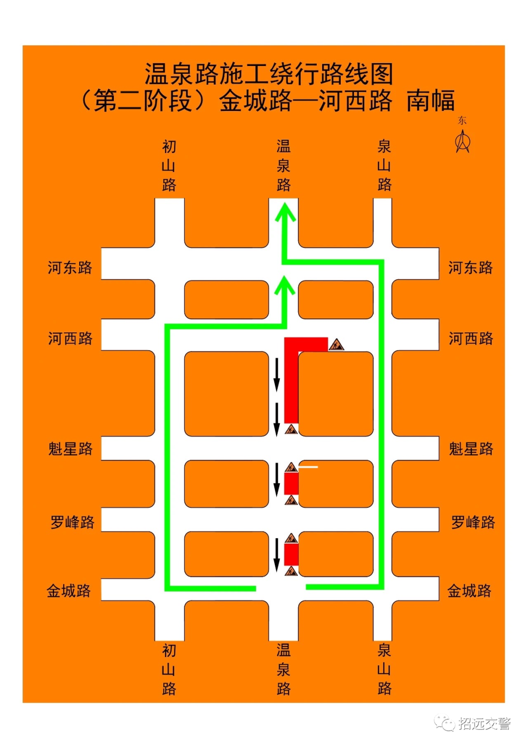 第二階段:金城路至河西路路段南幅封閉,自東向西行駛的車輛仍可正常通行,自西向東行駛的車輛可從溫泉路金城路口向左或向右轉繞行至初山路或泉山路。