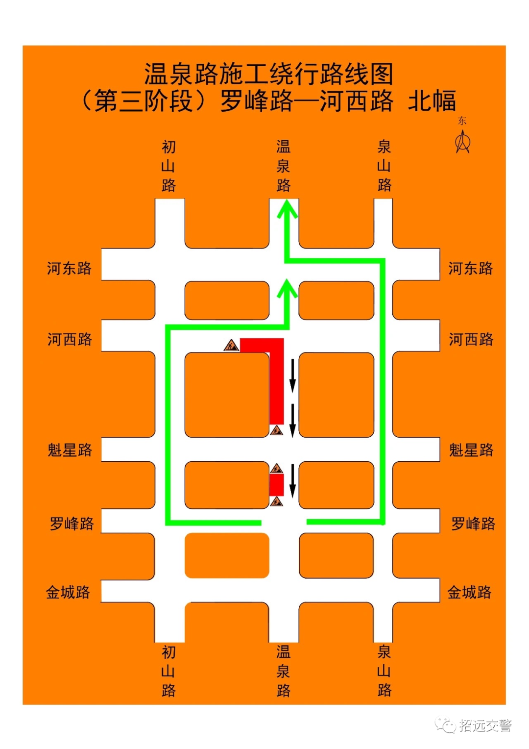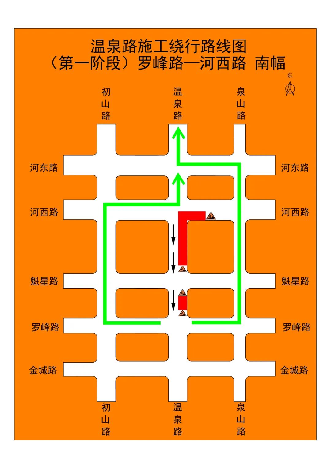 第三階段:羅峰路至河西路北幅封閉,但依然是自東向西行駛的車輛可正常通行,自西向東行駛的車輛可從溫泉路羅峰路口向左或向右轉繞行至初山路或泉山路。