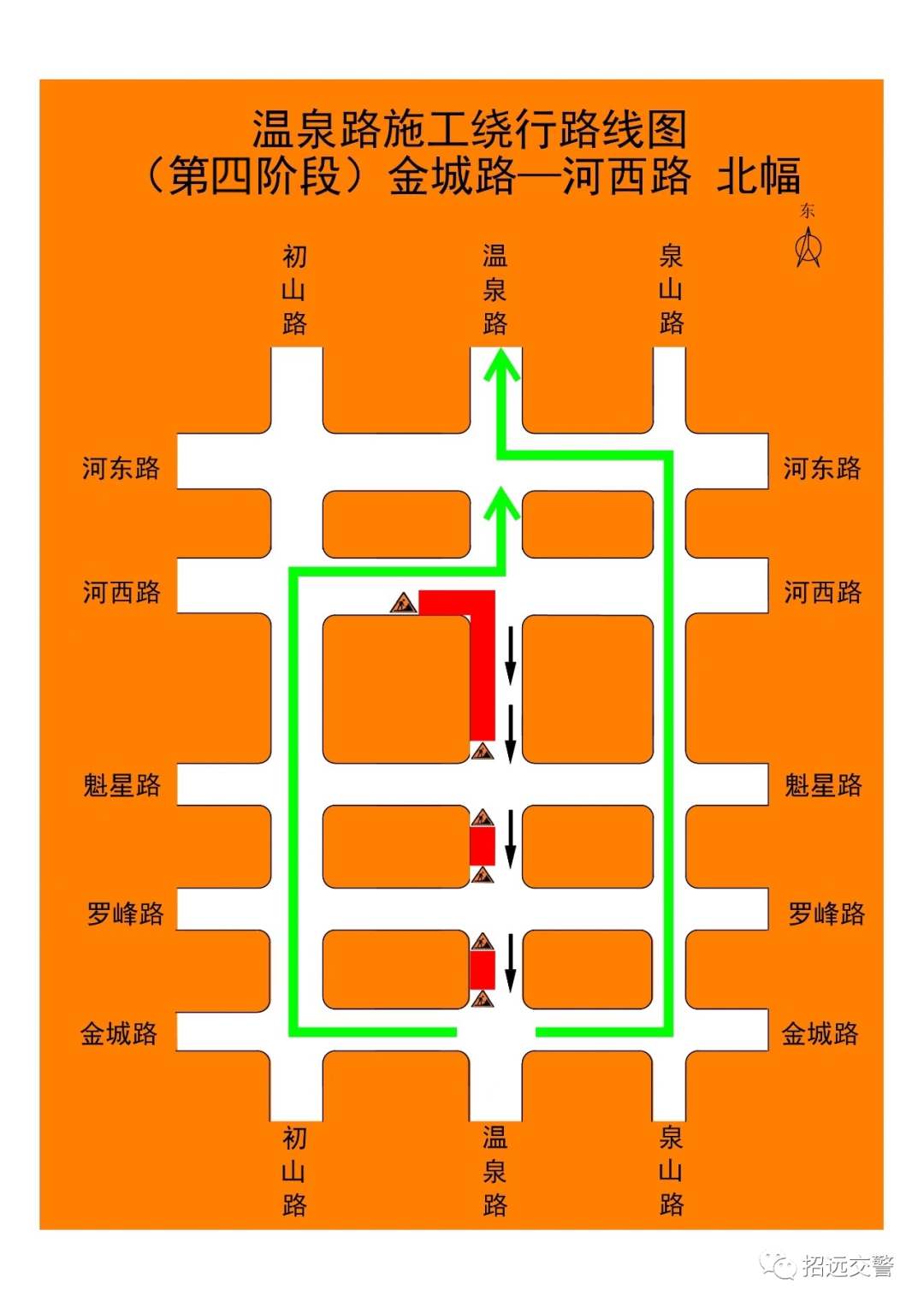 第四階段:金城路至河西路北幅封閉,但依然是自東向西行駛的車輛可正常通行,自西向東行駛的車輛可從溫泉路金城路口向左或向右轉繞行至初山路或泉山路。