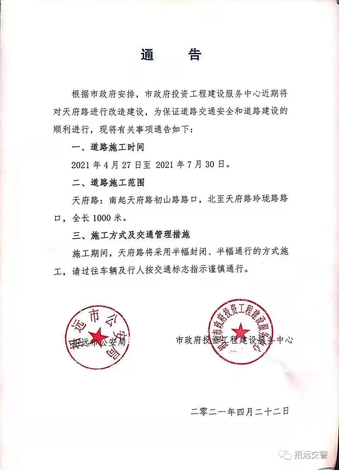 根據(jù)市政府要求,市政府投資工程建設(shè)服務(wù)中心近期將對天府路進(jìn)行改造建設(shè),為保證道路交通安全和道路建設(shè)的順利進(jìn)行,現(xiàn)將有關(guān)事項(xiàng)通告如下: